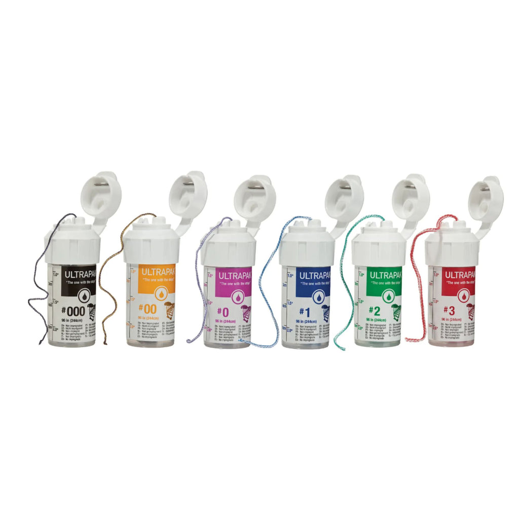 Ultrapak Plain Knitted Retraction Cords are designed to gently and effectively displace gingival tissue and control bleeding prior to impression taking. The unique knitted construction allows for easy packing and excellent tissue retraction without trauma. Suitable for use with or without hemostatic agents.